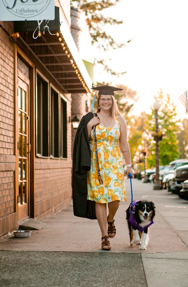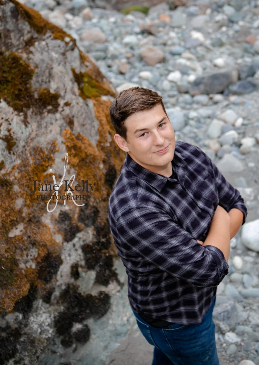Senior girl leans against a modern waist-high sidewalk wall wearing blue jeans, a white tee shirt, fitted plaid jacket, and adorns a straight rimmed black hat during sunset taken by Parker, CO senior photographer; Jane Kelly Photography.